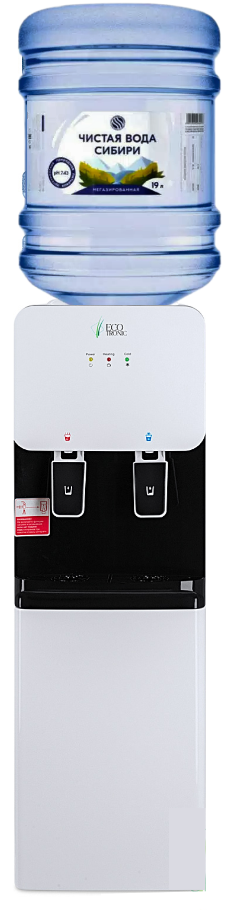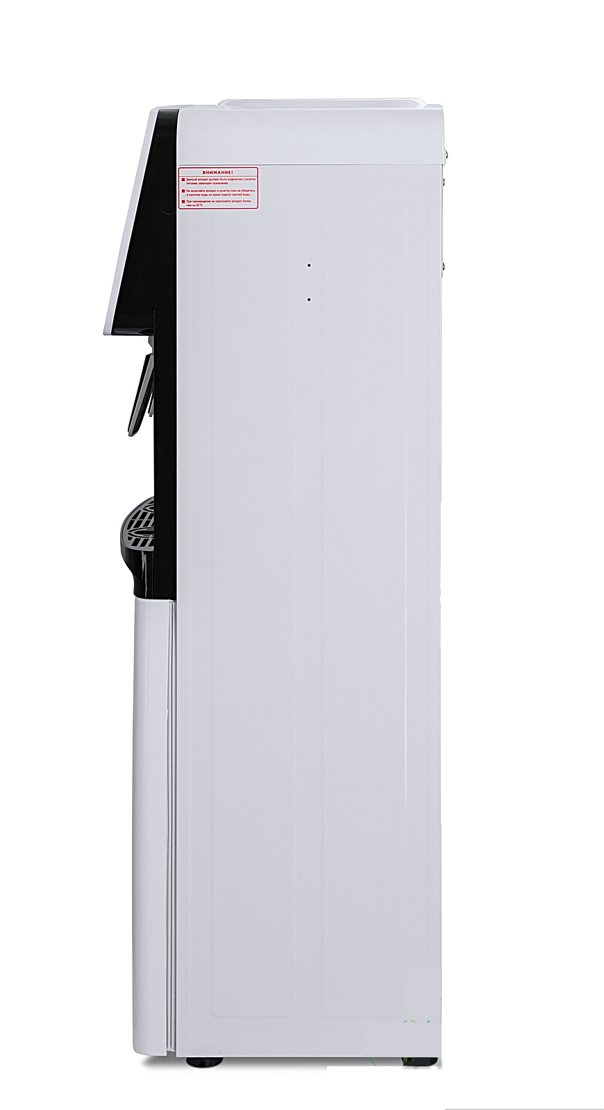Компактный кулер для воды с функциями нагрева и охлаждения. С небольшим шкафчиком в нижней части. Электронное охлаждение. Корпус белого цвета с черной вставкой в области кранов подачи воды. Индикация режимов нагрева, охлаждения и готовности воды. Краны «нажим кружкой».
