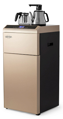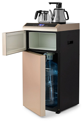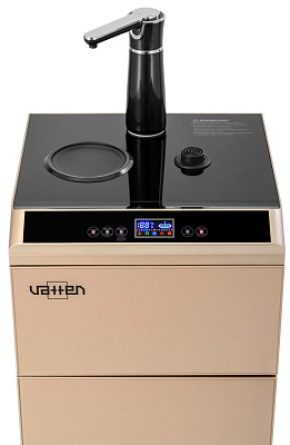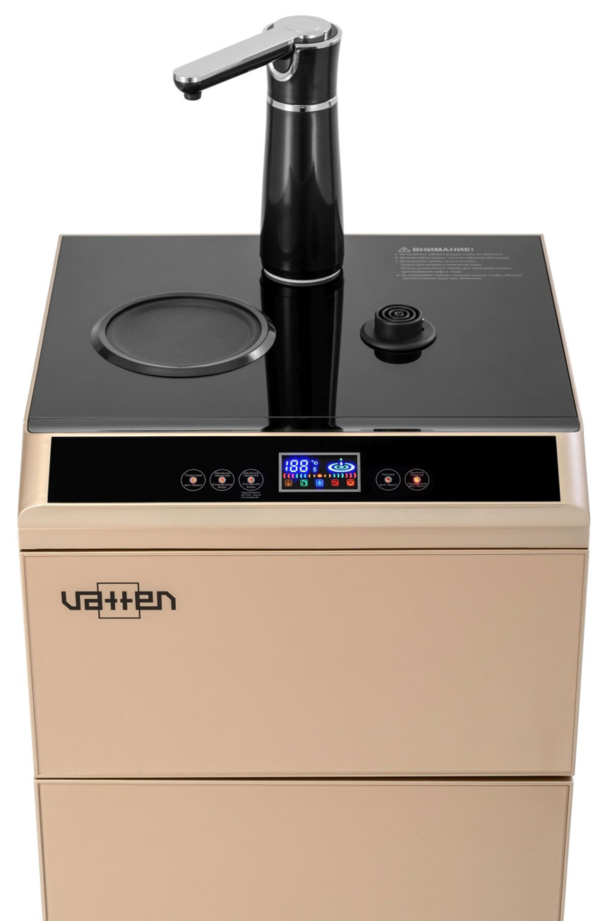 Кулер Vatten V45QE. Новинка кулера с нижней загрузкой бутыли - кулер сделанный по схеме "tea bar" ("чайный столик" - тиабар). Подача воды осуществляется через кран, установленный в верхней части аппарата.Кулер оснащен двумя чайниками: для заварки чая и для кипячения воды. Чайник для заварки имеет свое ложе для подогрева и поддержания температуры. В чайнике для кипячения вода начинает нагреваться после двойного нажатия на кнопку горячей воды. Нагрев отключается при достижении 100 °С. Встроенный дисплей отображает текущую температуру воды. Если вода в чайнике остыла, можно включить нагрев соответствующей кнопкой. Холодная вода подается из того же крана с помощью специальной кнопки.Шкафчик для хранения посуды и продуктов находиться под верхней панелью. Бутыль устанавливается в нижний шкафчик.