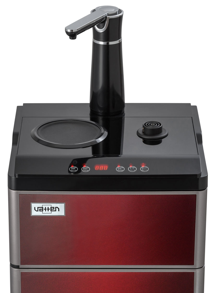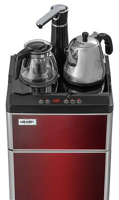Кулер Vatten V45QE. Новинка кулера с нижней загрузкой бутыли - кулер сделанный по схеме "tea bar" ("чайный столик" - тиабар). Подача воды осуществляется через кран, установленный в верхней части аппарата.Кулер оснащен двумя чайниками: для заварки чая и для кипячения воды. Чайник для заварки имеет свое ложе для подогрева и поддержания температуры. В чайнике для кипячения вода начинает нагреваться после двойного нажатия на кнопку горячей воды. Нагрев отключается при достижении 100 °С. Встроенный дисплей отображает текущую температуру воды. Если вода в чайнике остыла, можно включить нагрев соответствующей кнопкой. Холодная вода подается из того же крана с помощью специальной кнопки.Шкафчик для хранения посуды и продуктов находиться под верхней панелью. Бутыль устанавливается в нижний шкафчик.