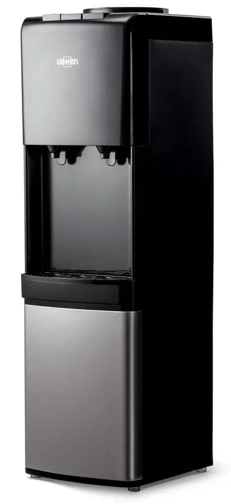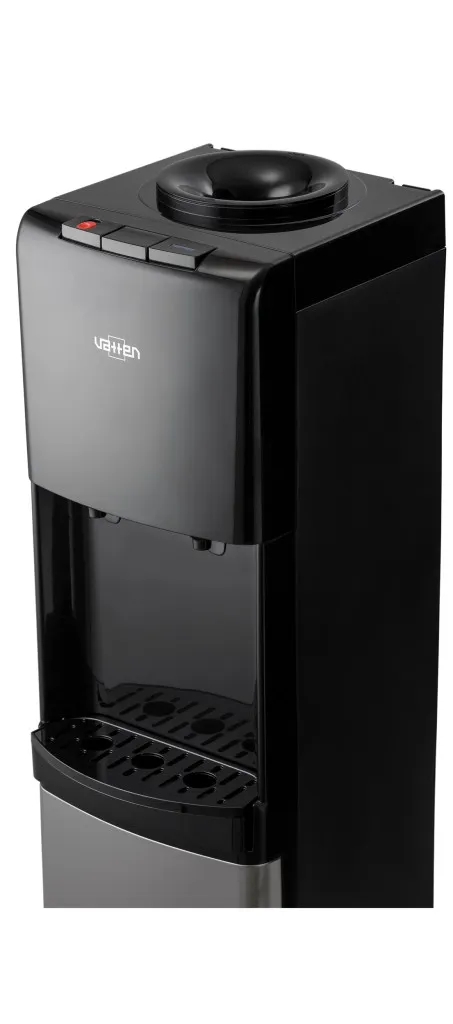 Компактный напольный кулер для воды c электронным охлаждением (плата Пельтье). Без шкафчика. Современный дизайн. Для дома. Для офиса. Бутылеприёмник, верхняя и передняя панель изготовлены из высококачественного, устойчивого к ультрафиолету ABS пластика чёрного цвета, нижняя панель из нержавеющей стали, боковые панели из пластика чёрного цвета. Два крана, управление кнопками - горячая и холодная вода. Кран горячей воды имеет "защиту от детей". Пригоден для эксплуатации в очень жарком климате - температура эксплуатации кулера от 10 до 38 градусов Цельсия.