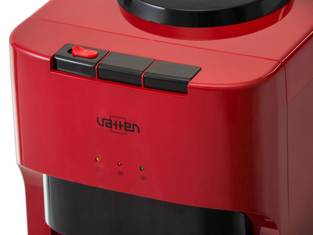 Напольный кулер для воды без шкафчика, без холодильника. Кулер для дома и офиса. Электронное охлаждение (0,6л/ч) + нагрев воды (6л/ч). Цвет красный. Три крана с кнопками. Подходит для домашнего и офисного использования, на предприятиях и учреждениях. Цвет корпуса красный. Бутылеприёмник, верхняя и передняя панели изготовлены из высококачественного, устойчивого к ультрафиолету ABS пластика. Боковые панели стальные. Баки горячей и холодной воды из нержавеющей стали. Три LED индикатора (включение питания, индикатор нагрева, индикатор охлаждения).